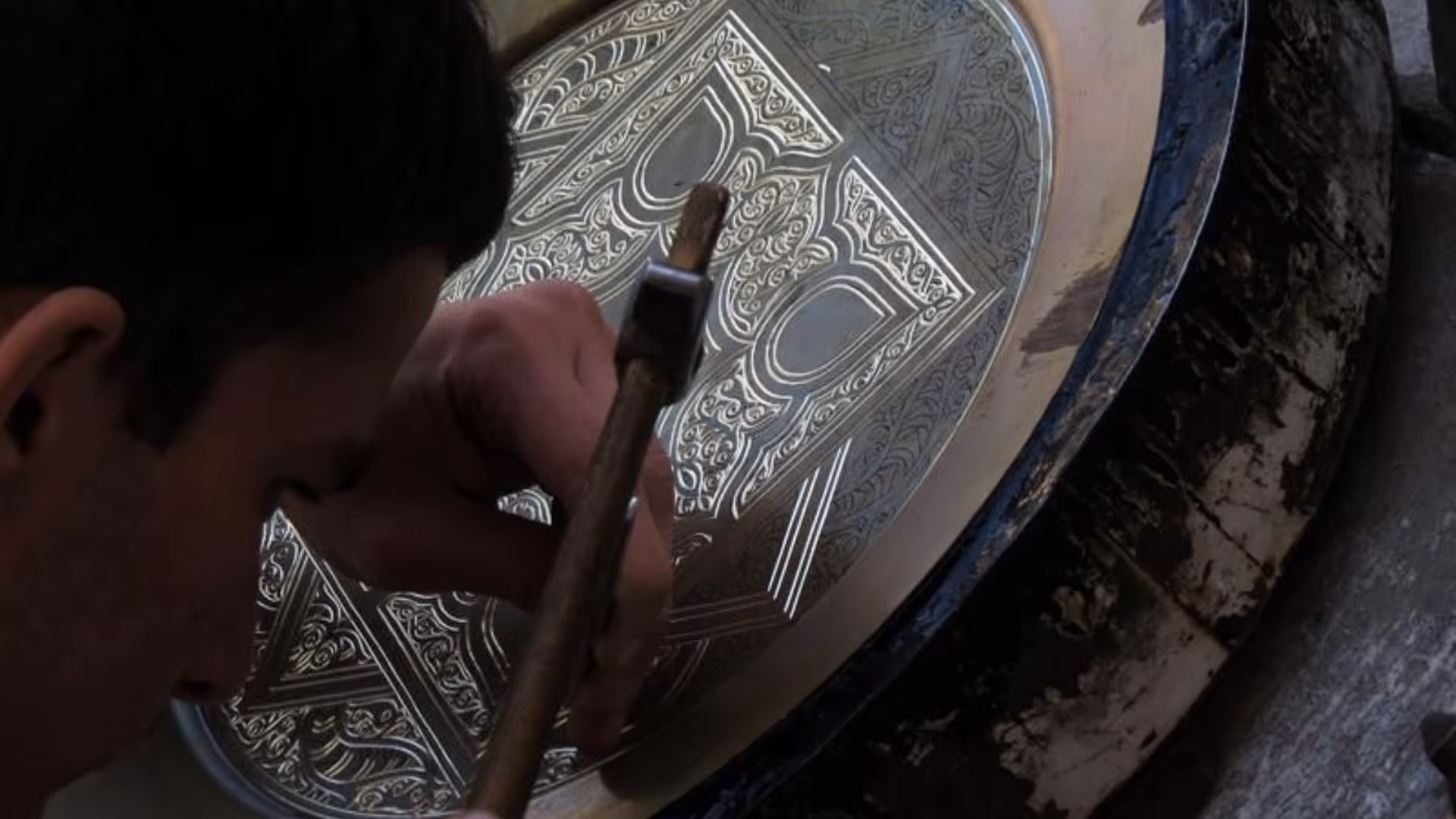 Steel is forged and shaped by hand, then inlaid with brass or silver in geometric patterns. A single ornamental piece can take days.