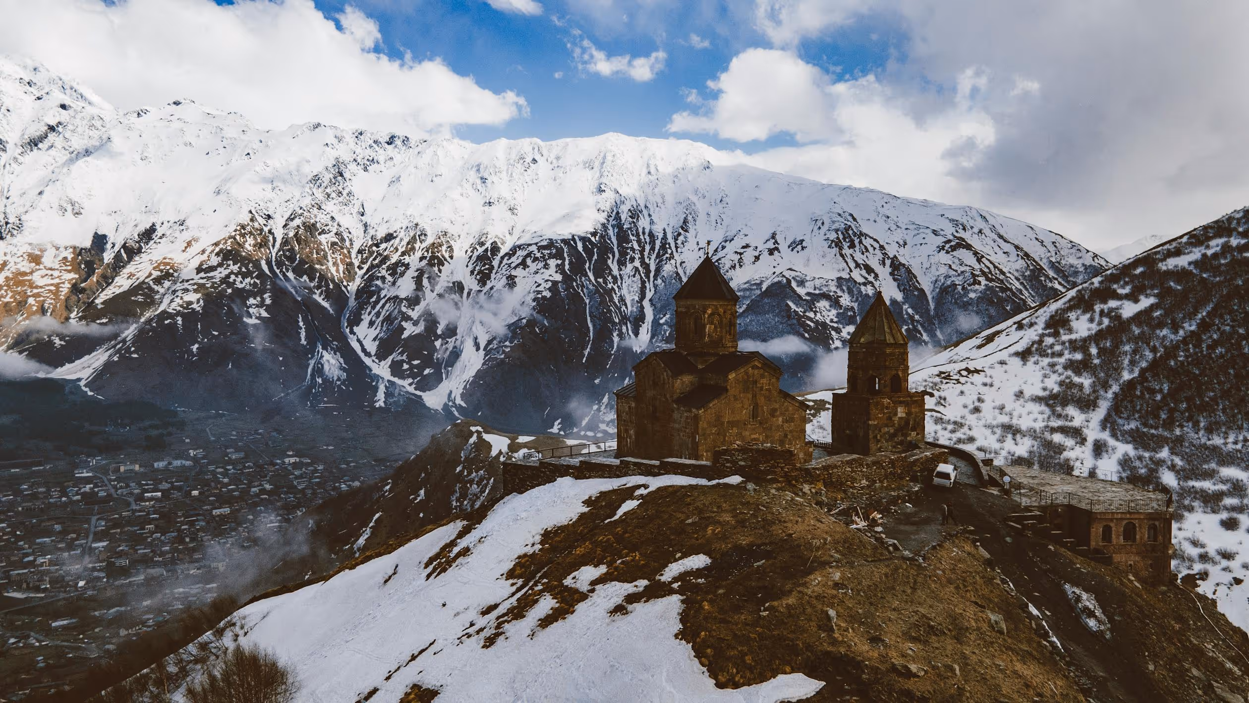 Follow the Georgian Military Highway, pausing at the Gudauri viewpoint before reaching Stepantsminda (Kazbegi).