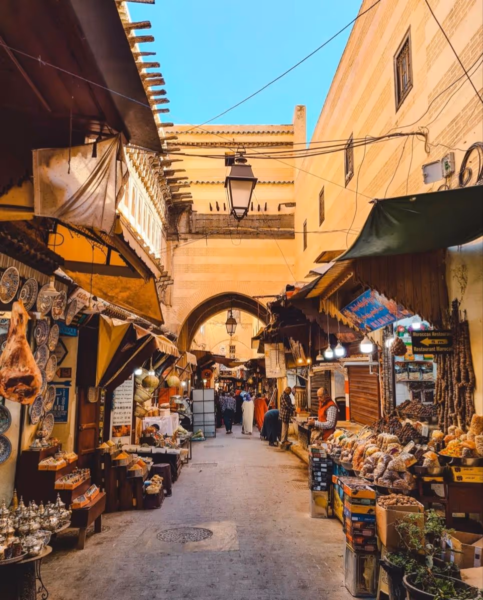 Fez is entered on foot. Beginning at Bab Boujloud, the medina unfolds through narrow alleys, workshops, madrasas, and courtyards. The scale is dense but human.